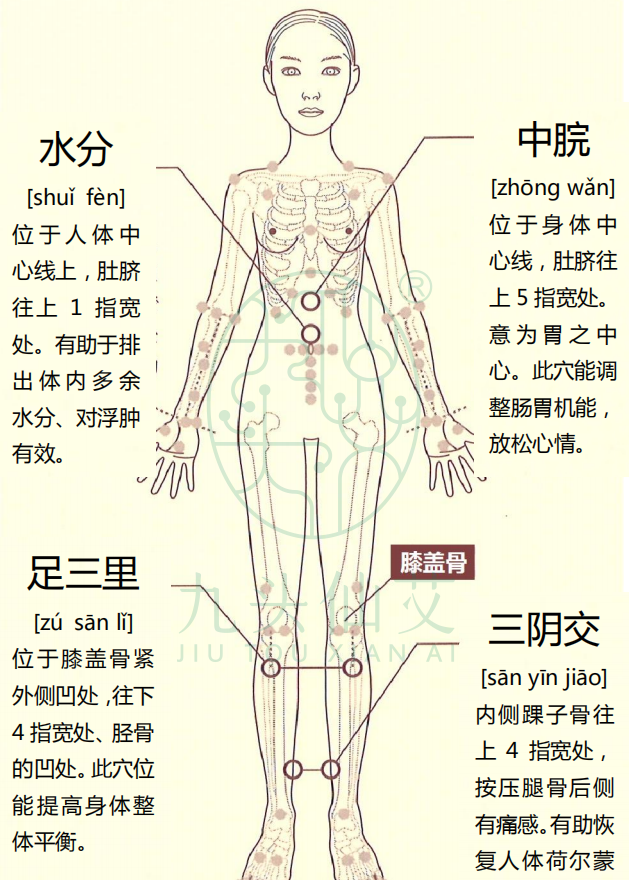 艾灸这些穴位主要是调理气血水的平衡、激活人体基本的新陈代谢。促进燃烧人体多余的能量、排出体内沉积的水分和废物。