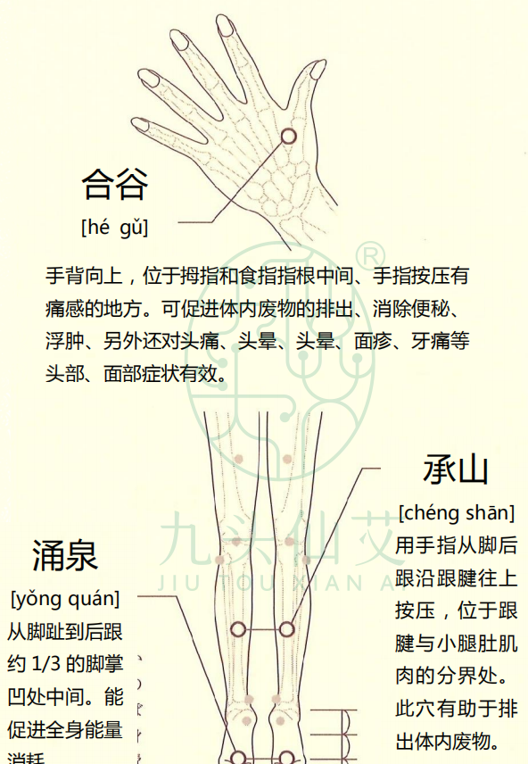 拇、食指并拢,于最高点取之。艾灸此穴和促进体内废物的排出、消除便秘、浮肿、另外还对头痛、面疹、牙痛等头部、面部症状有效