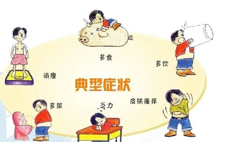 1、糖尿病的典型症状是“三多一少”,“三多”指多饮、多食、多尿,“一少”指消瘦。尿频症状夜间尤甚,类似清水的尿液中含有大量的糖分,有烂苹果味。