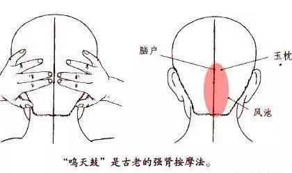 此方法即鸣天鼓,要掩着耳朵叩击枕骨,对头部、耳部都有一定的刺激。而中医认为,肾开窍于耳,脑为髓之海,所以此法有调补肾的作用。