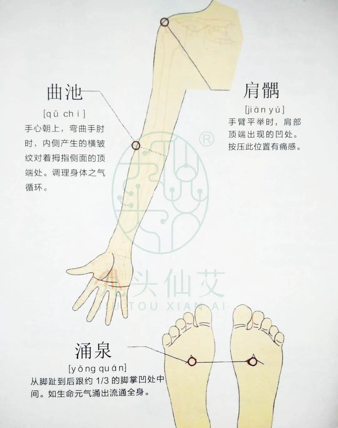 【功能主治】:皮肤瘙痒、荨麻疹、上肢瘫痪等。可调理身体之气循环