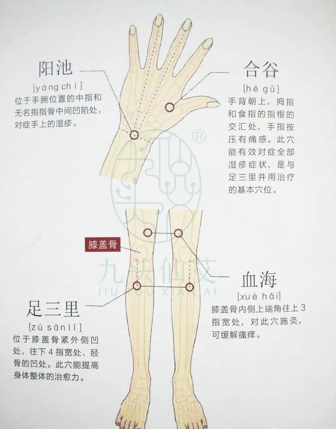 注意:湿疹在灸的过程中很容易病情反复,有可能越灸越重,这多是排病表现,是蓄积体内的寒湿之毒由内向外排的过程,所以一定不能半途而废。
