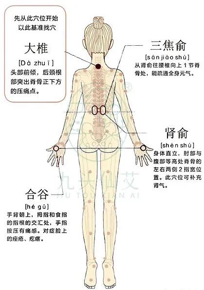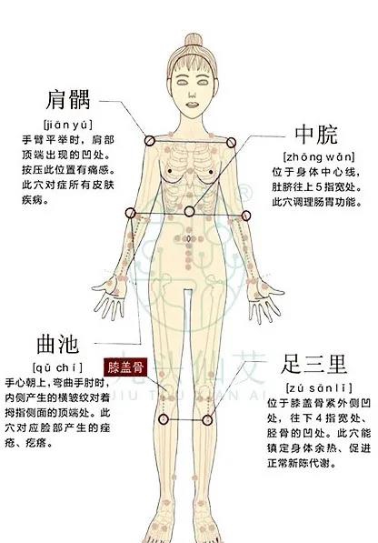 在肩峰前下方,当肩峰与肱骨大结节之间凹陷处;将上臂外展平举,肩关节部即可呈现出两个凹窝,前面一个凹窝中即为此穴。艾灸此穴疏经利节,祛风通络、理气化痰,此穴对症所有皮肤疾病。