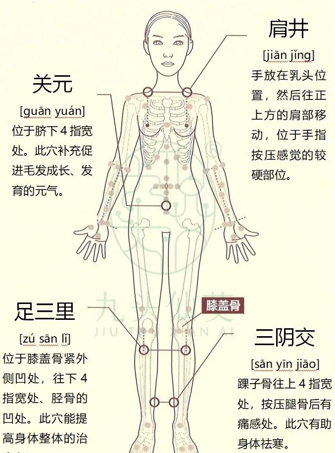 那么中医对于保护我们的秀发有没有好的办法呢?其实,老祖宗已经留下了很多宝贵的健康财富,比如穴位按摩就是一个很好的方法,很多的临床研究证实,按摩和艾灸穴位,可以很好的促进毛发的生长,呵护秀发的健康。气血充实,则毛发油亮。营养不足会影响毛发的生长和发育。穴位疗法以求元气充足,促进头部的气血循环。