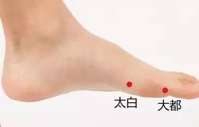 【取穴方法】在足内侧缘,当足大趾本节(第1跖趾关节)后下方赤白肉际凹陷处。
