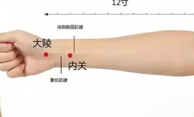 【取穴方法】大陵穴位于腕前区,腕掌侧远端横纹中,掌长肌腱与桡侧腕屈肌腱之间,仰掌取穴。