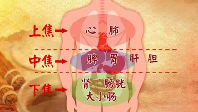 总观三焦,膈以上为上焦,包括心与肺;横膈以下到脐为中焦,包括脾与胃;脐以下至二阴为下焦,包括肝、肾、大小肠、膀胱、胞宫等。
