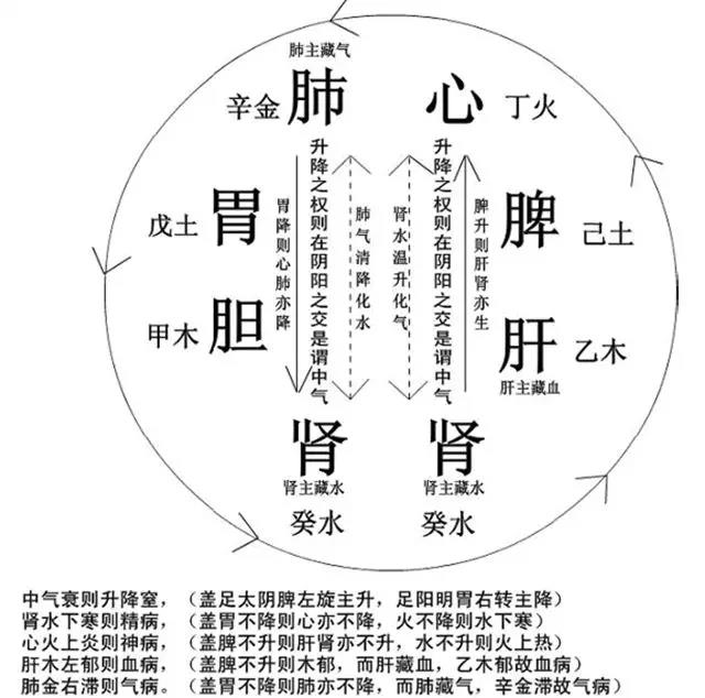 火本来是往上升的,水本来是往下沉的,因此要想火降水升,就必须有一个力量来推动,这个力量就是中气,它是气机升降的关键。