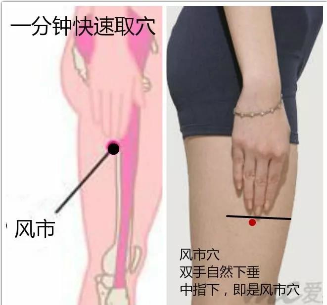 一分钟快速取穴:双手自然下垂,中指下,大腿中点处,就是风市穴
