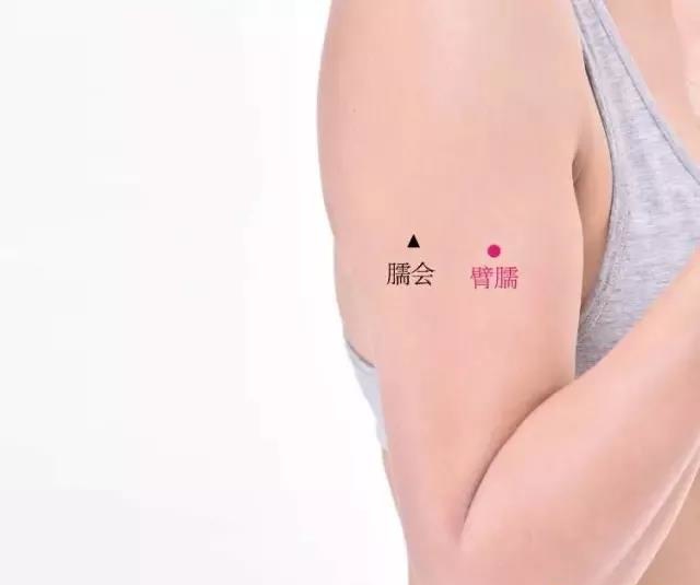 臂臑穴位于人体的臂外侧,三角肌止点处。艾灸或按摩此穴30~50次,可以促进血液循环,增加臂部肌肉的弹性,使上臂变得紧致。食指中指共同作圈状按压,感到酸痛的力度即可,也是简单易掌握的按摩穴位减肥法。